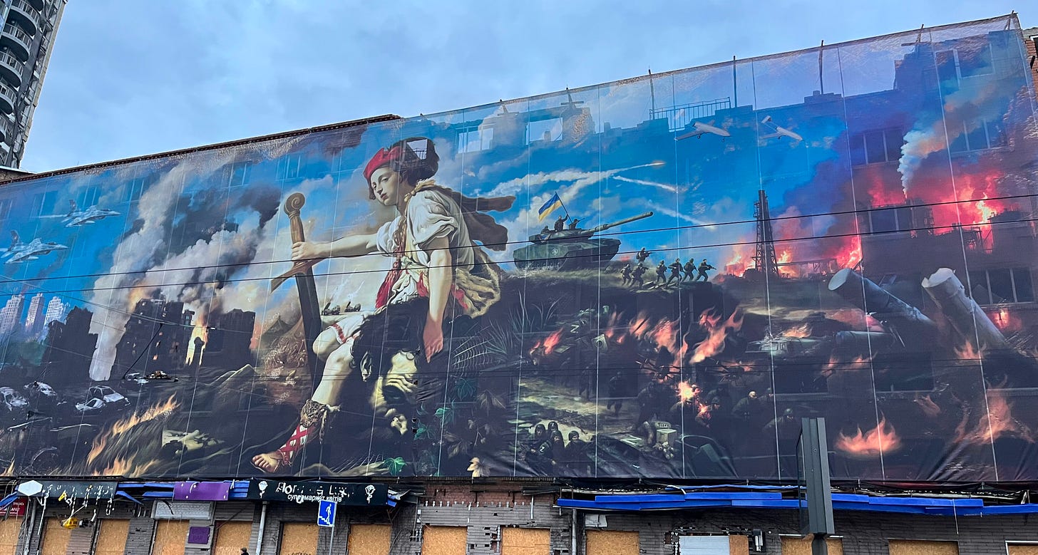 “Last night, I was privileged to catch up with my friends Yuri Sak and Gennadiy Kurochka in Kyiv. Yuri and Gennadiy are strategic communications experts and have worked extraordinarily hard since the beginning of the Russian full-scale invasion in February 2022 to ensure Ukraine’s strategic messaging penetrates into European, American and Asian audiences. This has been crucial to sustaining international support and assistance for Ukraine over the course of the war. Yuri and Gennadiy have also become good friends of mine over the last few years. Whenever we are in the same part of the world - Australia or Ukraine - we ensure we catch up. So it was wonderful to see them last night. They had a surprise for me. It was a big one. Before having dinner, they took me to the site of their latest project in Kyiv. It was a massive mural on the side of the factory that had been hit multiple times by Russian missiles and drones. The factory, and an adjacent office building, had been hit so many times by the Russians that it is unlikely that they will be rebuilt until after the war. It provided a suitable, if somber site for the mural. The mural is huge. It is nearly six stories tall and dozens of metres long. It celebrates Ukraine’s ongoing struggle to defend its freedom against the brutal Russian invasion. The mural has some interesting features. The central part of the design features David and a beheaded Goliath. No prizes for guessing that David is Ukraine and the now headless Goliath is Russia. Interestingly, if you look close to Goliath’s head, you can see spiderwebs. This was a deliberate inclusion to celebrate the June 2025 Operation Spiderweb that was executed by Ukraine to successfully attack Russian airbases.” (Mick Ryan/Futura Doctrina)